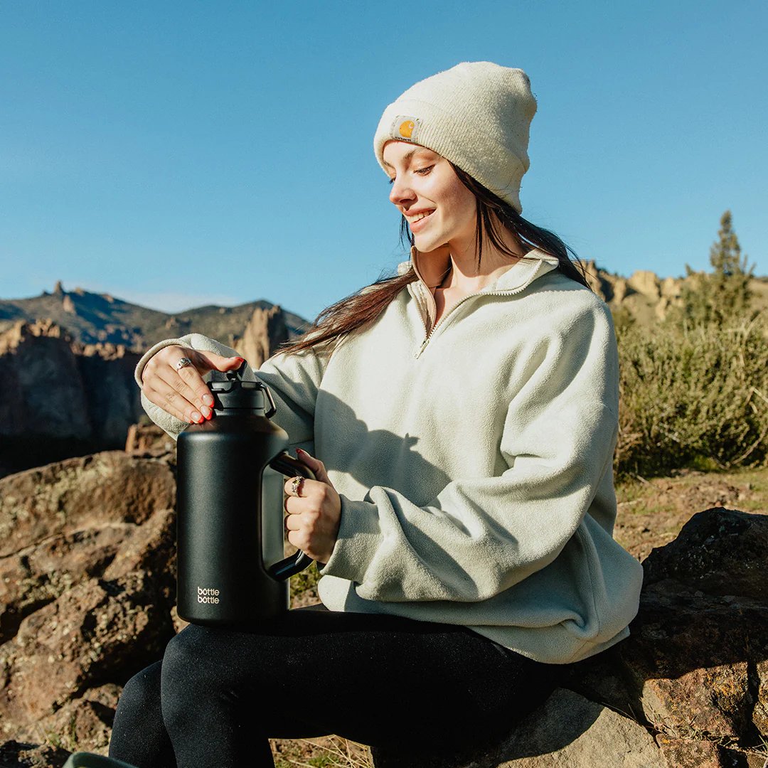Elevate your refreshment with bottlebottle 64 oz Insulated Growler. Eco-friendly stainless steel meets biodegradable materials for sustainable sipping. Keep cold for 24h, hot for 12h. Dual lids for convenience, a large handle for easy carry. Choose the eco-conscious style. Sip smart, live green!